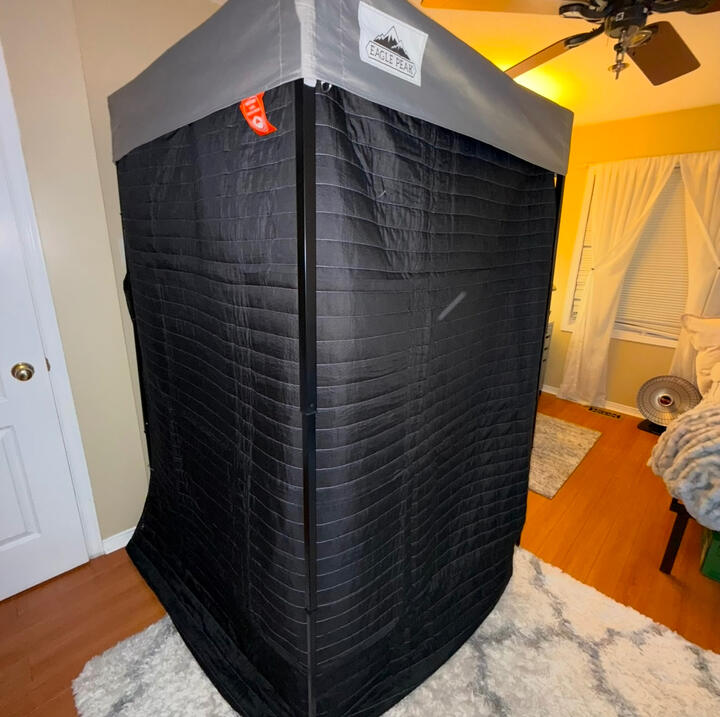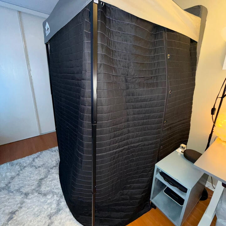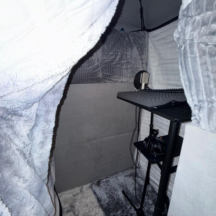 Well-treated booth with acoustic panels, acoustic blankets, and pillows